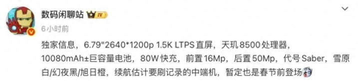 其将配备6.79英寸2640*1200p 1.5K LTPS直屏,内置10080mAh±大容量电板,撑捏80W快充,前置1600万像素自拍镜头,后置5000万像素镜头,代号Saber,提供雪原白/幻夜黑/旭日橙几款配色,续航预计要刷记载的中端机,暂定亦然春节前登场。